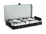Kit includes: 2-burner gas stove, pot and coffee stands, grill plates