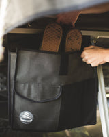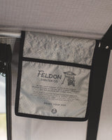 - Feldon Shelter's unique base mounted shoe & gadget pocket for extra storage. Keep your muddy shoes, outside and off the ground. The pockets also feature a vented bottom panel to drip dry your shoes overnight.