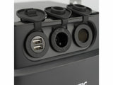 - Three-way charging via 12 V socket, solar panel or AC house power