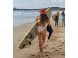 - Hard brim so you can punch through waves without worrying about it flopping around